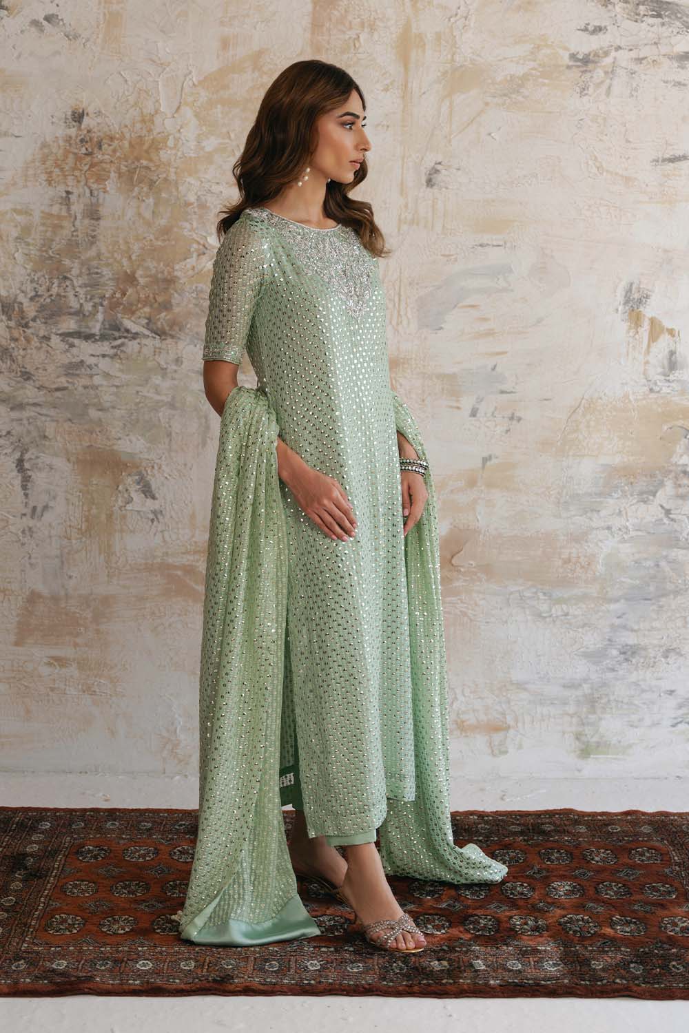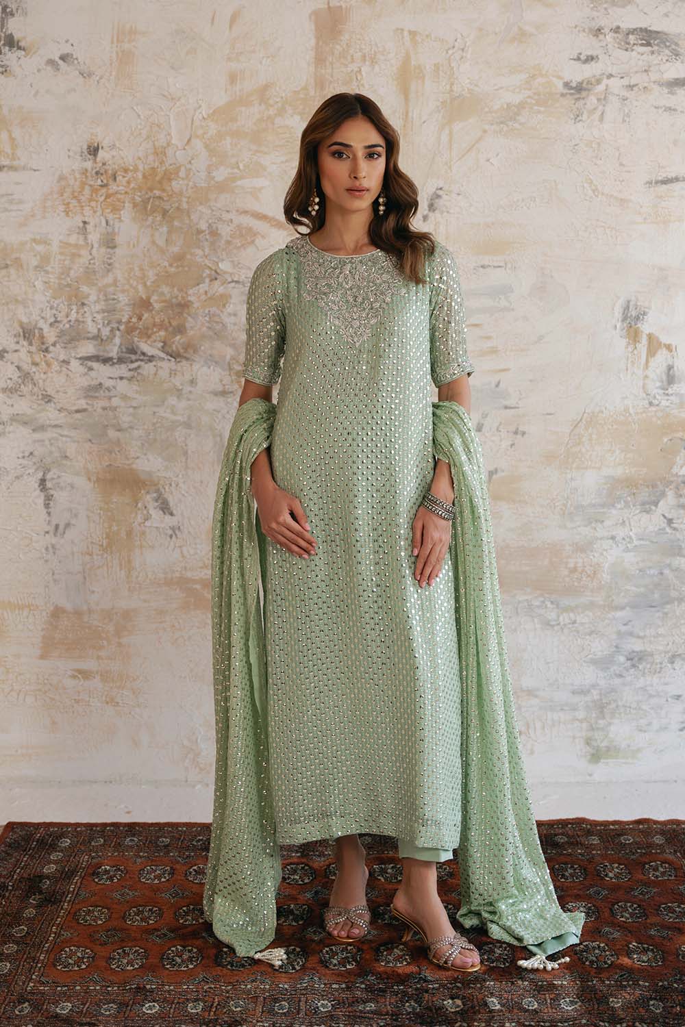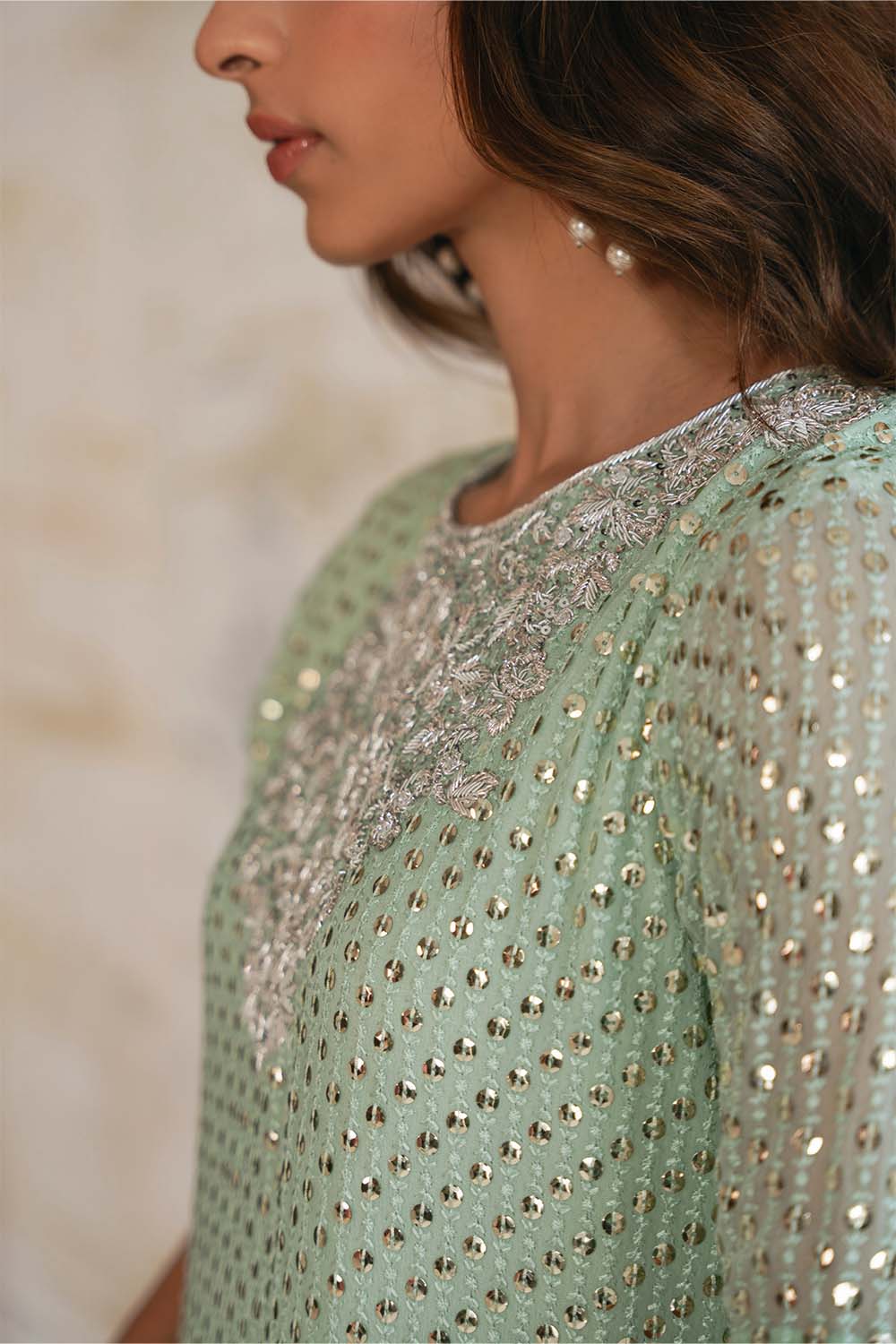 Fresh elegance meets delicate artistry. The Abeer set is a serene three-piece ensemble crafted from soft light green raw silk and adorned with exquisite Chantilly lace, finished with a sheer organza dupatta for an ethereal, refreshing statement.