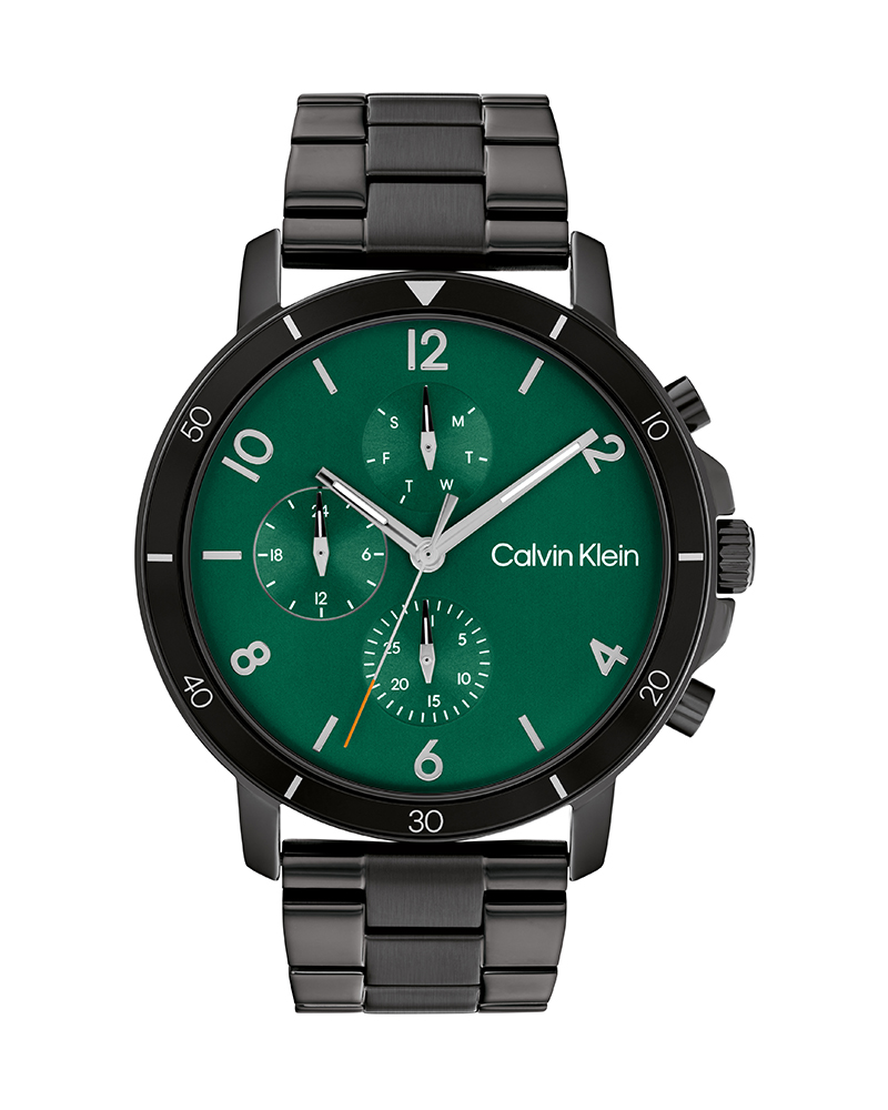 Bold, tactical, and strikingly elegant. This commanding 46mm watch pairs a vibrant emerald green dial with a stealthy black stainless steel bracelet, enhanced with a practical date window for everyday utility.