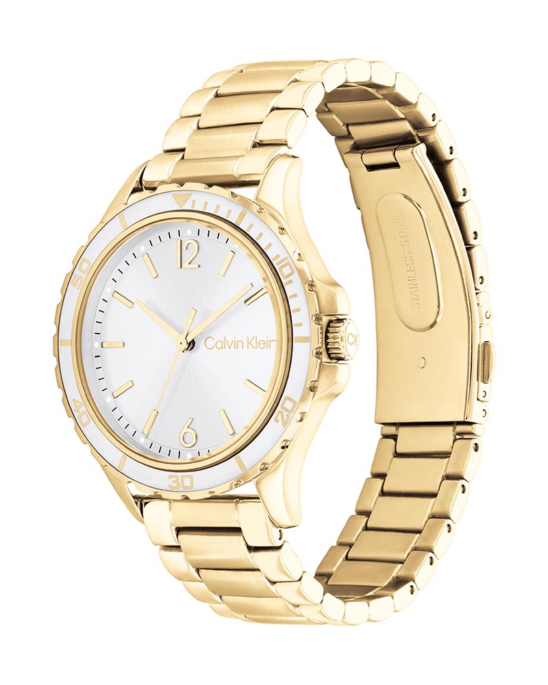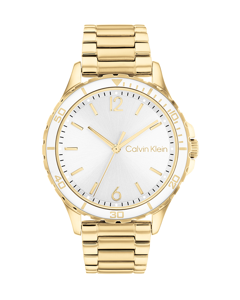 Timeless glamour meets modern minimalism. This elegant 38mm watch pairs a crisp, clean white dial with the warm glow of a gold-tone stainless steel bracelet, creating a look that’s both classic and effortlessly chic.