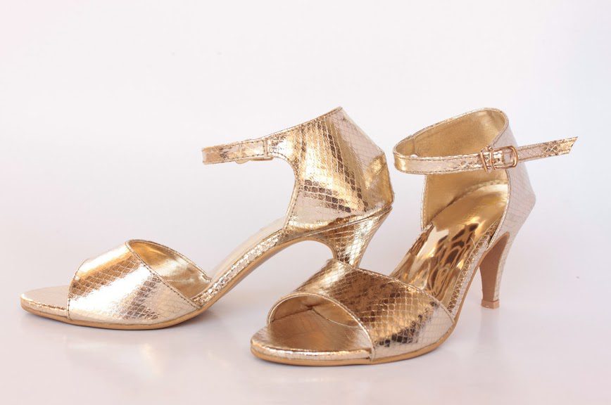 Golden heels with a unique honeycomb pattern that sparkles from every angle. Perfect party shoes that look expensive and feel light.
