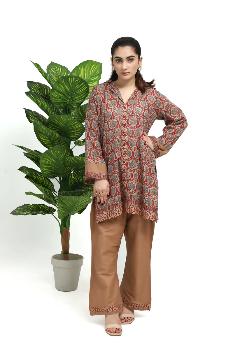 Where effortless elegance meets modern comfort. This exquisite two-piece set from Jaanib blends a delicate ivory floral print shirt with chic light brown culottes, creating a look that’s both refined and refreshingly versatile.
