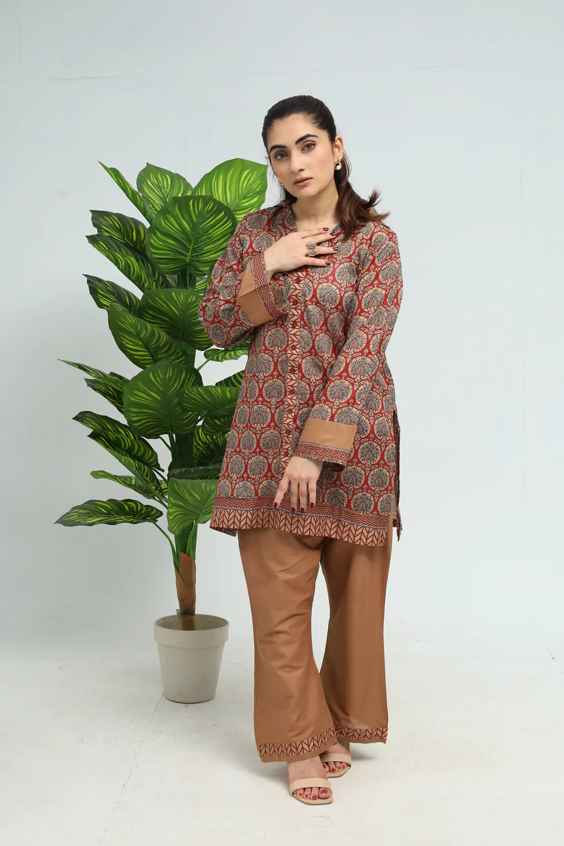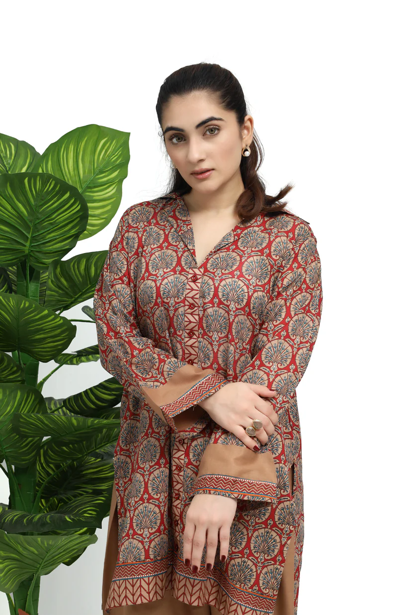 • Shirt Design: Floral Print, Button Patti, ¾ Sleeves with Printed Borders