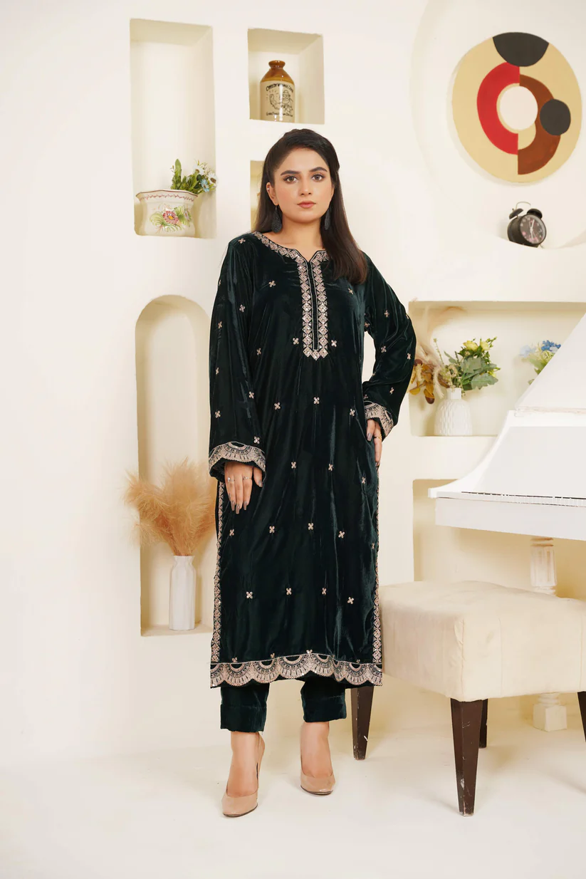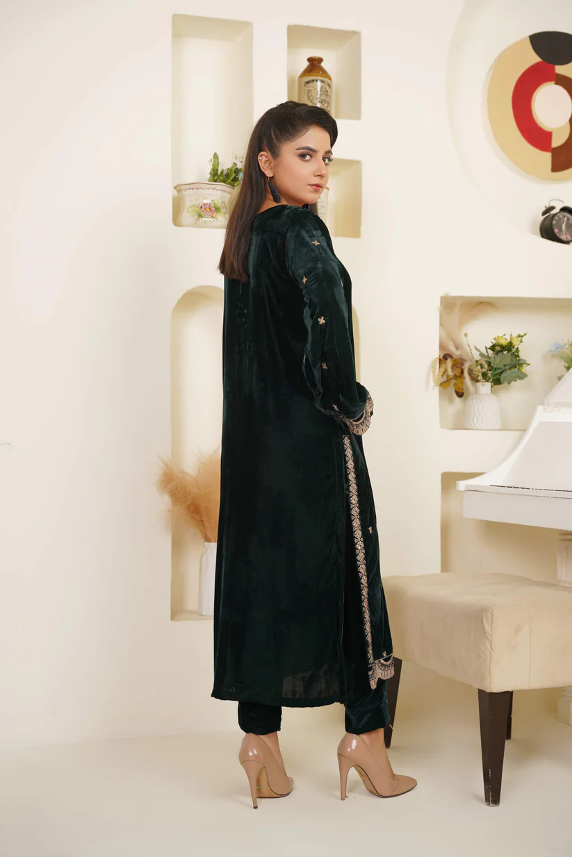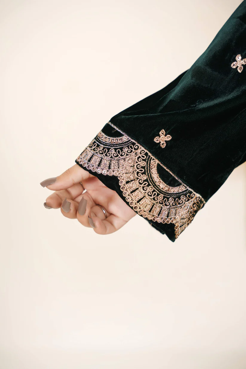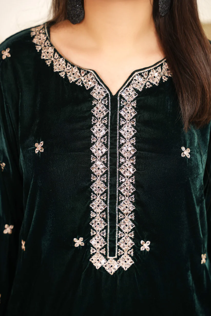 A twilight dream in velvet. This deep bottle-green two-piece set glows with the subtle shimmer of copper-silver threadwork, blending regal texture with minimalist elegance for an unforgettable statement.