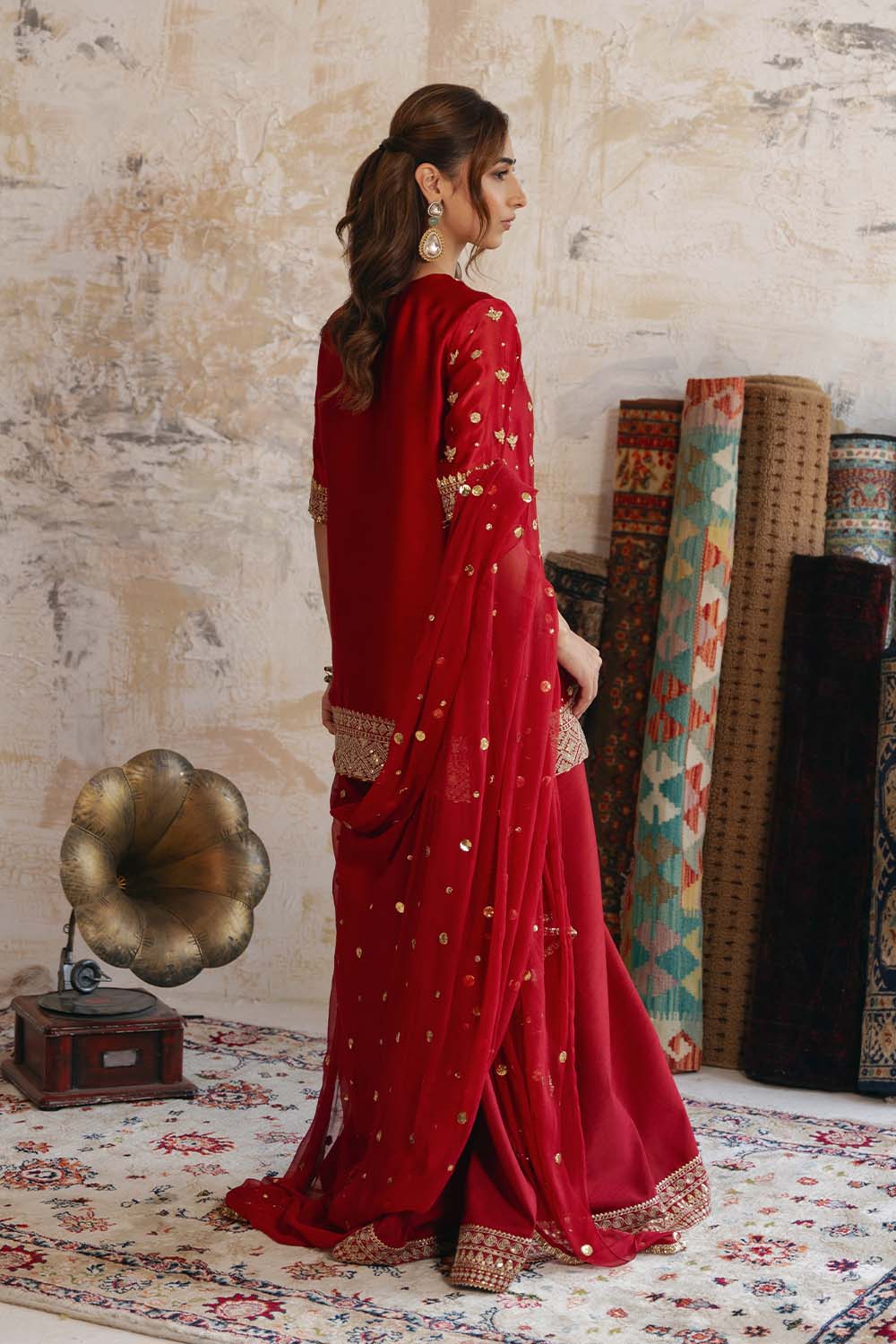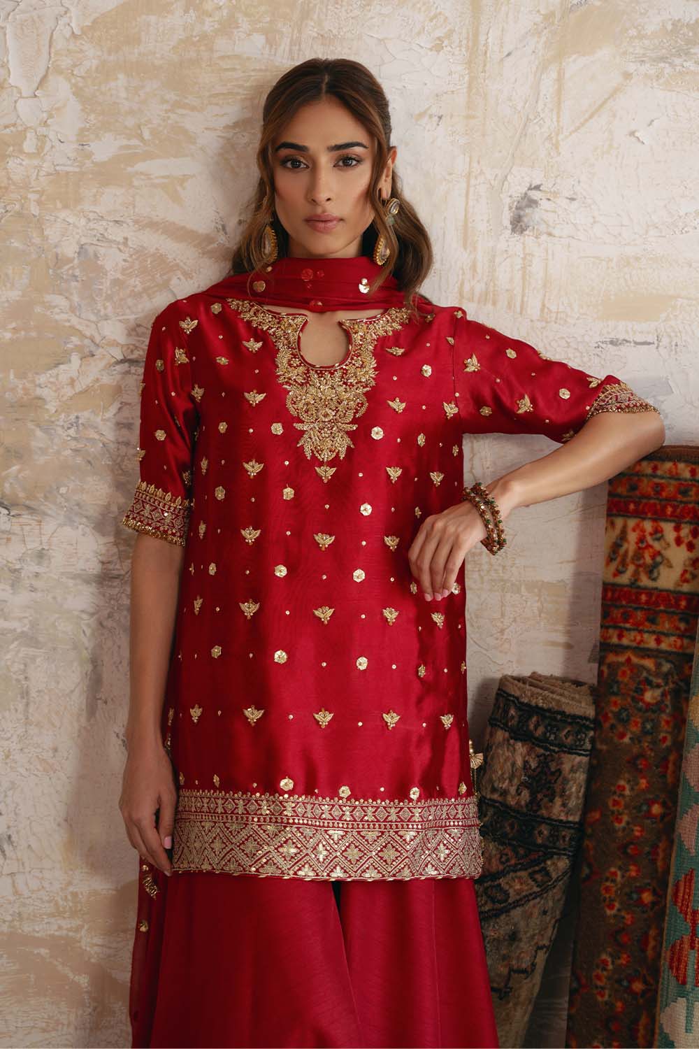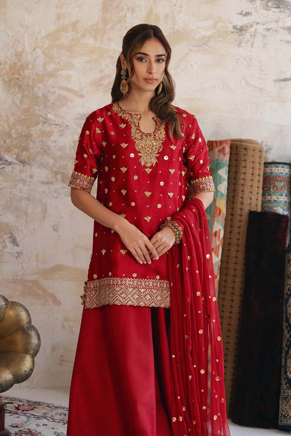 - Set Includes: Red Raw Silk Shirt + Red Raw Silk Pants + Pure Organza Dupatta
