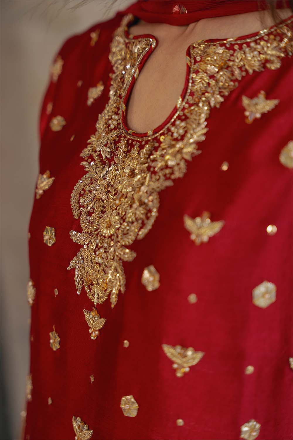 Bold elegance meets delicate artistry. The Tasmia set is a luxurious three-piece ensemble crafted from rich red raw silk and adorned with exquisite Chantilly lace, finished with a sheer organza dupatta for an ethereal yet vibrant statement.